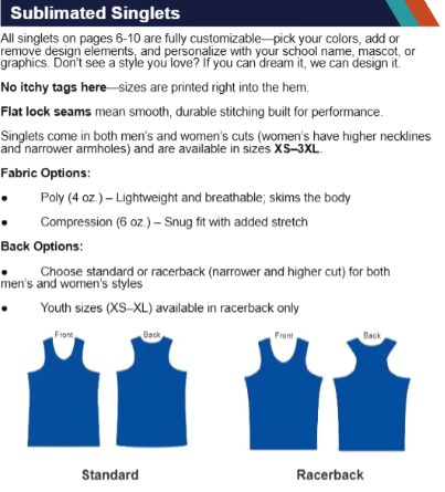 Want to see what’s possible? Check out pages 6–10 in our 2025 catalog for custom singlet inspiration. Have questions or ready to start? Reach out today here.
