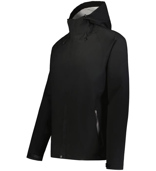 RAIN SECURE WATERPROOF SHELL Waterproof 100% polyester with DWR and PU coating is stain resistant. Also features heat sealed label, high collar, full-zip with hook-and-loop neck closure, hood with inside adjustable shockcord closure, sealed seams for protection from rain, raglan sleeves, front zippered pockets with waterproof coating, open bottom with snap closure, and dropped tail bottom. Outfit your team in Rain Secure Waterproof Shell, built for sports teams and organizations at all levels. Made with 100% breathable polyester featuring a DWR (Durable Water Repellent) and PU coating, this garment is highly effective against rain. Stain-resistant and provides durability and longevity. Makes an excellent waterproof layer over sweatershirts, fleeces, or other mid-weight layers. The shell features a heat-sealed label, a high collar, a full-zip with hook-and-loop neck closure, and a hood with an adjustable shockcord closure. Sealed seams enhance its waterproof capabilities. Raglan sleeves allow for free movement, and front zippered pockets with waterproof coating keep valuables safe. The open bottom with snap closure and a dropped tail bottom offer additional protection and versatility, making it suitable for various team environments. Colors available: Black.