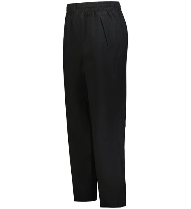 RAIN SECURE WATERPROOF PANT Waterproof 100% polyester with DWR and PU coating is stain resistent. Is designed to be worn over regular pants. Also features heat sealed label, elastic waistband with inside adjustable shockcord closure, front openings for pocket accessibility, back zippered pocket with zipper garage, sealed seams for protection from rain, and zipper on outside lower leg. Brave the storm in the Rain Secure Waterproof Pant, engineered for team performance in even the toughest conditions. Made from 100% breathable polyester with a DWR and PU coating, these pants are both water-resistant and waterproof. The stain-resistant fabric ensures lasting durability and the elastic waistband with an adjustable shockcord closure provides a secure fit over team uniforms. Front openings allow for easy access to pockets underneath, and a back zippered pocket with zipper garage adds functionality. Designed to be worn over regular pants, these waterproof and water-resistant pants are ideal for teams across various sports facing harsh conditions. Colors Available: Black.