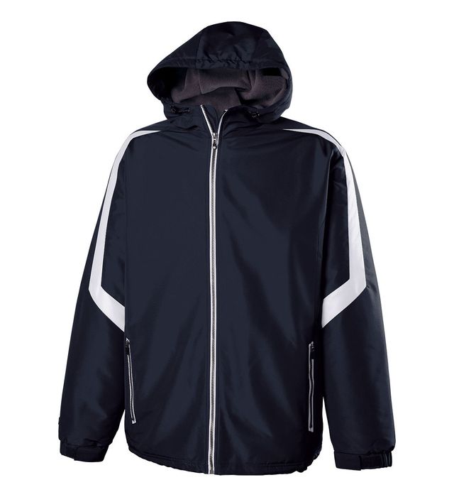 Cold Secure Jacket Waterproof 100% recycled polyester with 100% polyester fleece lining. Also features a hanger loop label, high collar with full front zipper and storm flap with zipper garage, 3-piece hood with inside adjustable shockcord closure, set-in sleeves, front zippered pockets with single welts, inside pocket, half-elastic cuffs, and open bottom with drawcord. Gear up for cold and wet weather in the Cold Secure Jacket, a robust and environmentally friendly choice, made entirely from 100% recycled polyester. Perfect for teams, this jacket features a 100% polyester fleece lining, ensuring breathability and warmth in various conditions. The high collar with a full front zipper and storm flap, coupled with a zipper garage, provides extra protection from the elements, while its three-piece hood with adjustable shockcord closure is designed for optimal coverage in any environment. The jacket has set-in sleeves, front zippered pockets with single welts, an inside pocket, half-elastic cuffs, and an open bottom with a drawcord for an adjustable fit. Colors Available: Navy/White, Black, Kelly Green/White, Royal/White, Maroon/White, Black/White, Navy, Carbon, Scarlet/White.