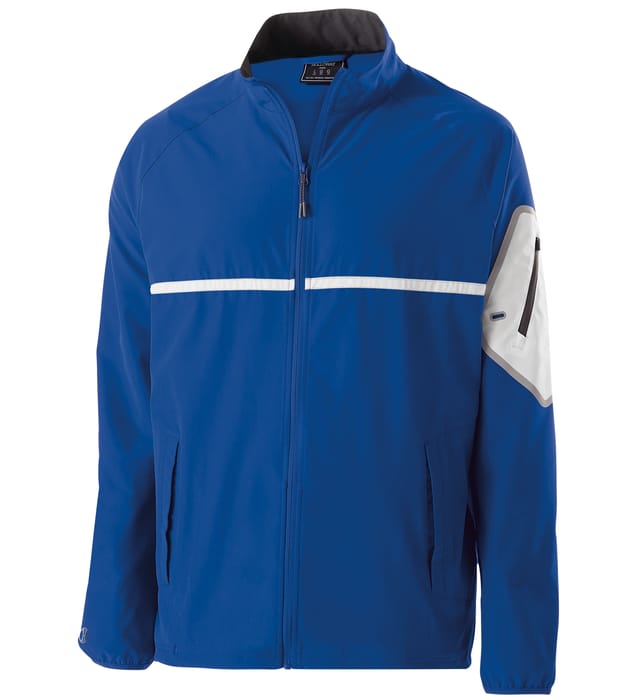 Weld Jacket 90% polyester/10% spandex, 4-way stretch woven fabric. Features a woven label, front zipper with reflective zipper pull and matte tips, contrast color sleeve pocket with silver media port and reflective metallic silicone welded zipper, raglan sleeves for maximum mobility, locking welt front pockets, dual inside pockets, spandex bound cuff, open bottom with adjustable elastic hidden drawcord, water-repellent. The Weld Jacket is designed for teams looking for lightweight, weather-resistant outerwear. Made from a 90% polyester and 10% spandex blend, this jacket features 4-way stretch woven fabric that ensures maximum mobility and comfort. The water-repellent fabric keeps you dry in light rain, while the front zipper with reflective zipper pull and matte tips adds a sleek touch. The jacket includes a contrast color sleeve pocket with a silver media port and reflective metallic silicone welded zipper for added functionality and style. Raglan sleeves provide excellent range of motion, and locking welt front pockets, along with dual inside pockets, offer secure storage. The spandex-bound cuffs and open bottom with an adjustable elastic hidden drawcord ensure a snug fit. Available in multiple colors, the Weld Jacket is perfect for maintaining a cohesive team appearance in all weather conditions. Availble in Men’s and Women’s sizing. Colors available: Navy/White, Royal/White, Kelly Green/White, Purple/White, Carbon/White, Maroon/White, White/Carbon, Black/White, Dark Green/White, Orange/White, Scarlet/White. Women’s Colors Available: Navy, White, Carbon, Black.