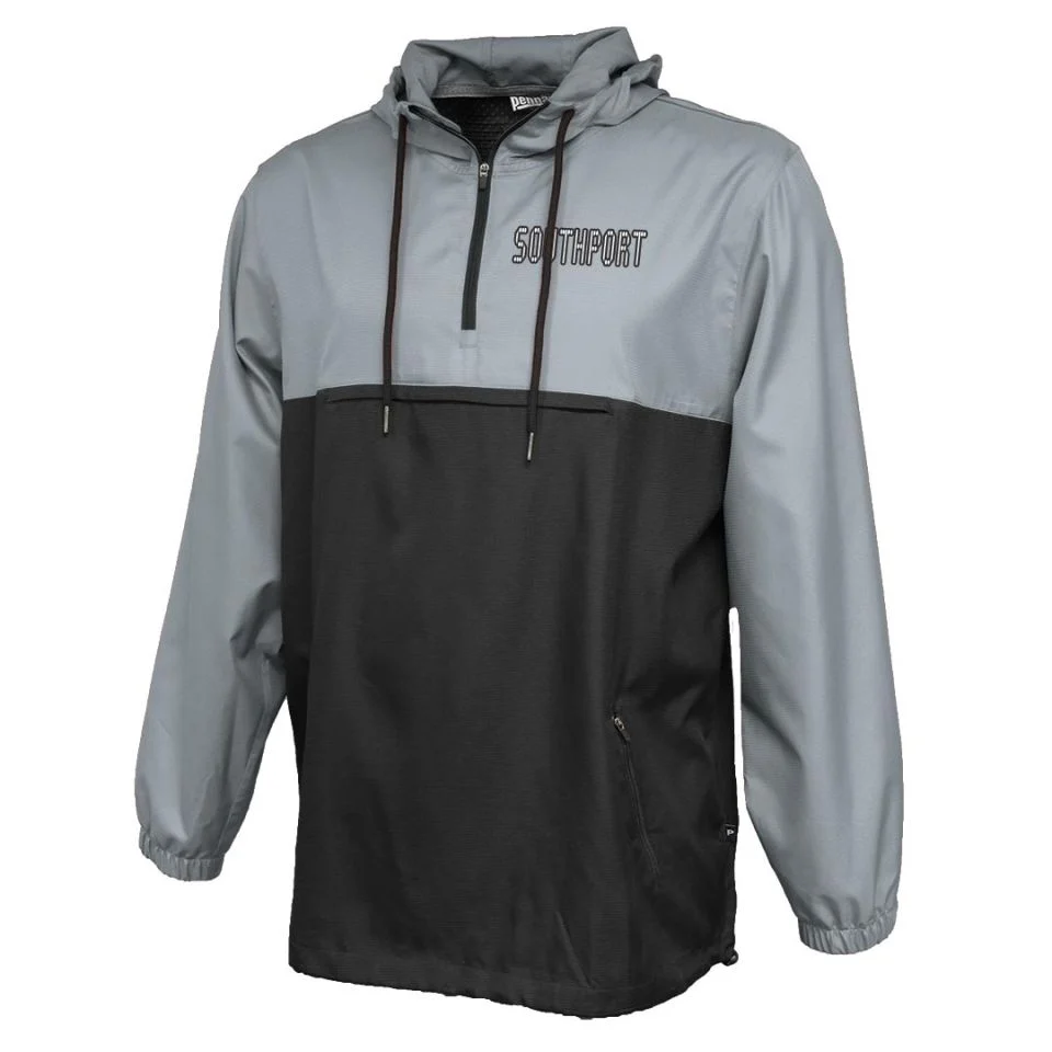 Legend Hooded Pullover 90% polyester/10% spandex lightweight stretch woven fabric with durable water-repellent finish, with high collar, half-zip pullover style zipper garage. Also features a 3-piece hood with drawcord, set-in sleeves, side zippered pockets, inside mesh valuables pocket, spandex bound cuffs, open bottom. The Legend Hooded Pullover is tailored for teams and athletes who need outerwear that’s both versatile and functional. Composed of 90% polyester and 10% spandex, this lightweight stretch woven fabric includes a durable water-repellent finish, key for staying dry in different weather conditions. The 4-way stretch enhances mobility, making it suitable for a range of activities from sports to casual team events. The high collar and half-zip style with a zipper garage blend functionality with a streamlined look. NOTE: Low Temperature or Low “bleed” Inks and Heat Transfers only. Its 3-piece hood with drawcord allows for adjustable coverage, while set-in sleeves offer a comfortable fit. The pullover also features side zippered pockets and an inside mesh valuables pocket for secure storage. Finished with spandex-bound cuffs and an open bottom, it ensures a snug, comfortable fit. Colors Available: Royal/Black, White/Navy, Black, Carbon, Carbon/Black, Scarlet/Black, Navy, White/Carbon, Dark Green/Black.